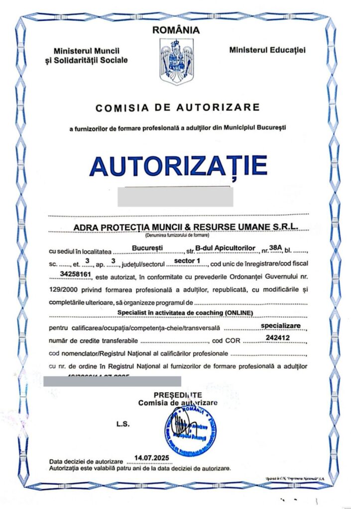 Autorizație oficială ce ne permite sa organizam cursuri de Coaching autorizate